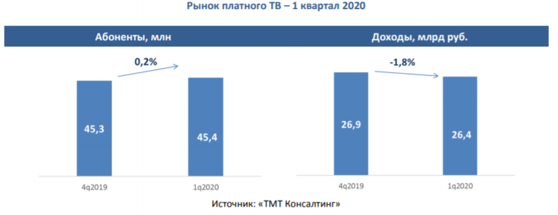 Аналитическое агентство "ТМТ Консалтинг" представило отчет по рынку платного ТВ за I квартал 2020 года. Число абонентов платного ТВ в России выросло на 0,2% по сравнению с предыдущим кварталом и составило 45,4 млн. Прирост – около 80 тыс. – оказался наименьшим за последние годы.