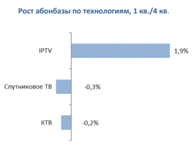 Единственным сегментом, демонстрирующим рост абонентской базы, остается IPTV – число подписчиков услуги платного ТВ по этой технологии увеличилось за квартал на 180 тысяч, более 90% из них подключили три компании – "Ростелеком", МТС и "ВымпелКом". Продолжают переводить своих абонентов на пакеты IPTV + ШПД и небольшие локальные операторы.