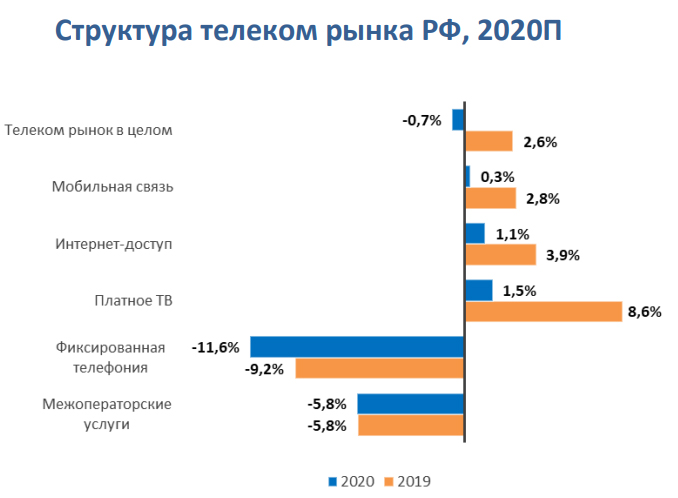 К негативной динамике привело снижение темпов роста в сегментах мобильной связи, широкополосного интернет-доступа и платного ТВ. Небольшой рост этих рынков не смог компенсировать падение доходов от фиксированной телефонии, межоператорских услуг и ряда других сервисов.