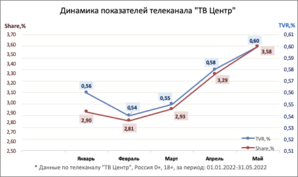 К своему юбилею, специально для "Кабельщика", телеканал подвел итоги за период с января по май 2022 года. Так, драйверами роста показателей смотрения за указанный период для ТВЦ стали детективные сериалы, выходящие в рамках линейки "Вечерний детектив на ТВЦ", а также оригинальные проекты, снятые по книгам известных писательниц (Устинова, Платова, Михалкова и др).