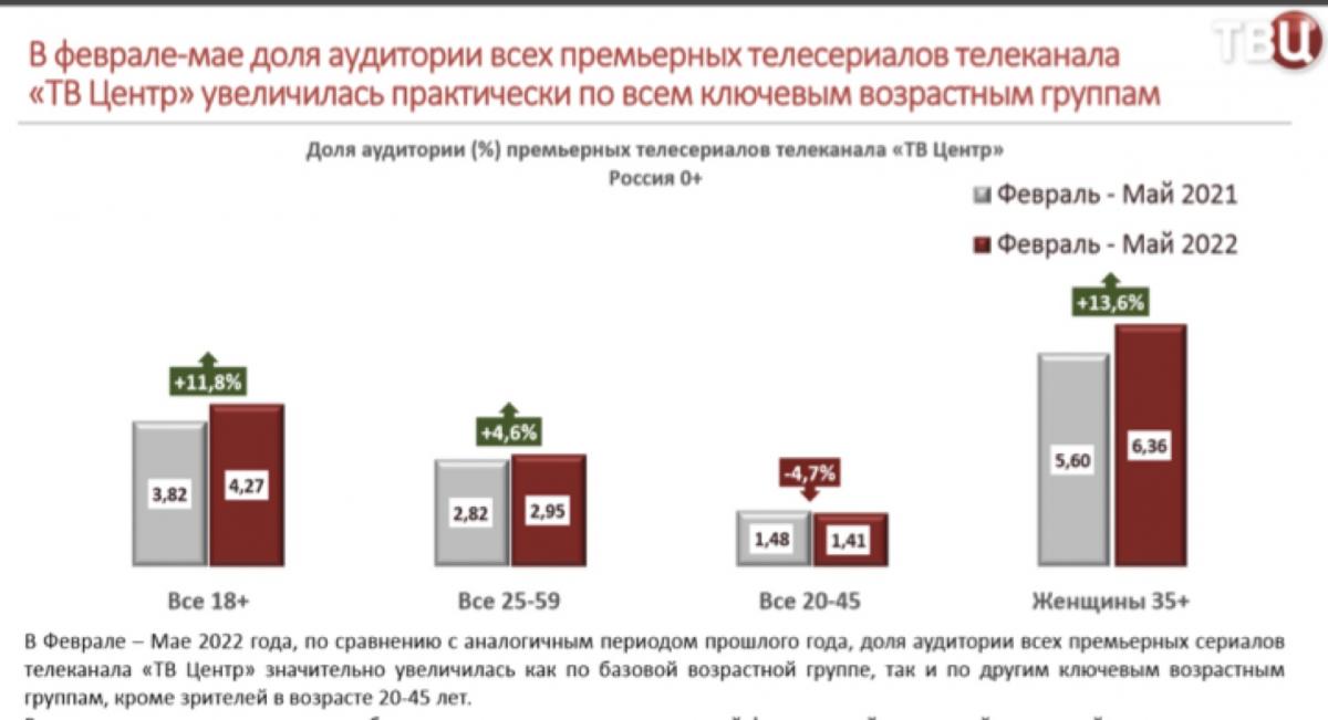 В феврале-мае 2022 года, по сравнению с аналогичным периодом прошлого года, доля аудитории всех премьерных сериалов телеканала увеличилась как по базовой возрастной группе, так и по другим ключевым возрастным группам. В текущем году было показано 39 премьерных фильмов. ТОП-5 сериалов: "Некрасивая подружка", "Я знаю твои секреты", "Сельский детектив", "Доктор Иванов", "Психология преступления". Продолжение этих и других сериалов ТВЦ зрителей ожидает в новом телесезоне.