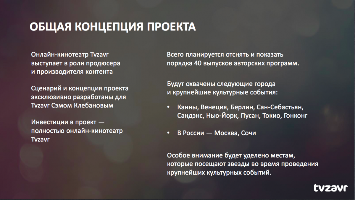 Онлайн-кинотеатр TVzavr займется производством телевизионного контента. В настоящий момент речь идет о цикле передач о российских и международных кинофестивалях, таких как Каннский кинофестиваль, Венецианский, Берлинский и прочие. Предварительно проект охватывает фестивали в 10 разных городах (помимо обозначенных, это Москва, Сочи, Гонконг, Торонто, Токио, Сан-Себастьян, Нью-Йорк и др.), по которым в течение года суммарно будет выпущено 40 передач. Цикл призван привлечь молодежную аудиторию - мужчин и женщин в возрасте от 16 лет и старше.