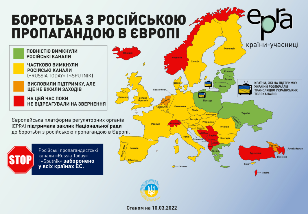 Национальный совет по телерадиовещанию Украины опубликовал сводную карту стран Европы, которые полностью или частично отказались от вещания российских федеральных телеканалов, единогласно транслирующих видение и позицию российских властей по отношению к военным действиям в Украине. Сообщается также, что Европейская платформа регуляторных органов (EPRA) координирует информацию от европейских медиарегуляторов в этом вопросе.
