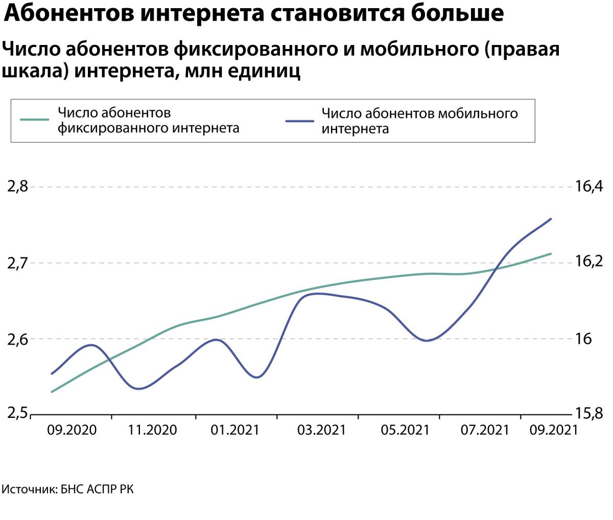 Абонентская база мобильного интернета также выросла – с 15,9 млн единиц в сентябре 2020 году до 16,3 млн единиц в 2021 году. Широкополосный доступ имеется у 98,7% абонентов беспроводного интернета.