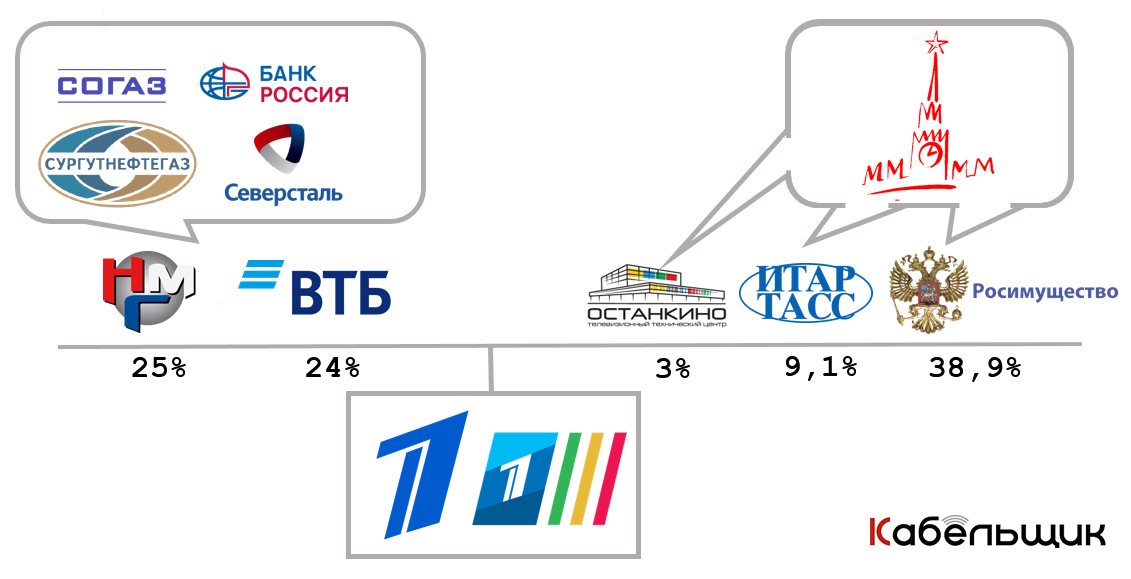 По состоянию на апрель 2013 года контрольный пакет телеканала принадлежал государству (Росимущество — 38,9%, ФГУП ИТАР-ТАСС — 9,1% и ФГУП ТТЦ „Останкино“ — 3,0%) — 51 %, 25% акций принадлежали НМГ (через ООО "РастрКом-2002), еще 24% компании у ОРТ-КБ Романа Абрамовича. Последний, как стало известно в апреле этого года, продал свою долю в этом банку ВТБ после того, как попал в те же санкционные списки.