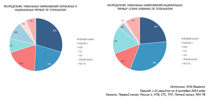 По данным аналитиков, 70% премьер по-прежнему приходится на тройку лидеров – Первый канал, "Россия 1" и НТВ. При этом основной рост в новом сезоне обеспечили Первый канал, СТС и ТНТ. В частности, Первый канал запустил в эфир более 80 премьерных проектов, что почти на 30% больше, чем было в прошлом году.