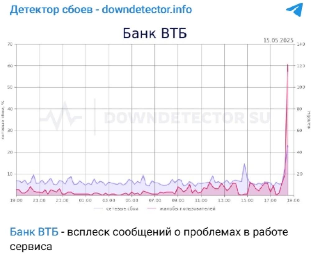 В частности, в этот день был зафиксирован рост числа жалоб на сбои в сервисах ВТБ, как следует из данных downdetector. Пользователи сообщали о сбоях в работе как сайта банка, так и мобильного приложения.