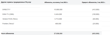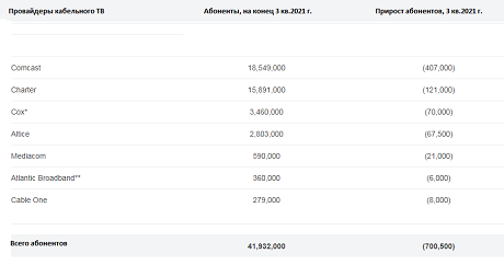 В отчете также говорится, что ведущие провайдеры кабельного телевидения потеряли около 700 тыс. видео-абонентов в 3 квартале 2021 года — по сравнению с потерей около 380 тыс. пользователей в 3 квартале 2020 года.
