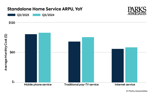 По данным Parks Associates, которые опубликовало издание "Advanced television", в период с III квартала 2023 года по III квартал 2024 года американцы, не использующие пакетные предложения телеком-услуг, сообщили о росте ежемесячных расходов. Сейчас среднемесячные затраты опрошенных граждан США составляют $100 на мобильную связь, $91 на платное телевидение, $71 на интернет и $53 на услуги безопасности.