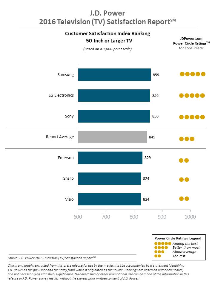 Аналитики также утверждают, что респонденты (а опрос проводился в июне, в нем принимали участие 3733 покупателя, которые приобрели телевизор за последние 12 месяцев), купившие ТВ с экраном 50 дюймов и более, наилучшим образом оценили телевизоры марки Samsung (859 баллов), следом с одинаковыми показателями идут LG и Sony.