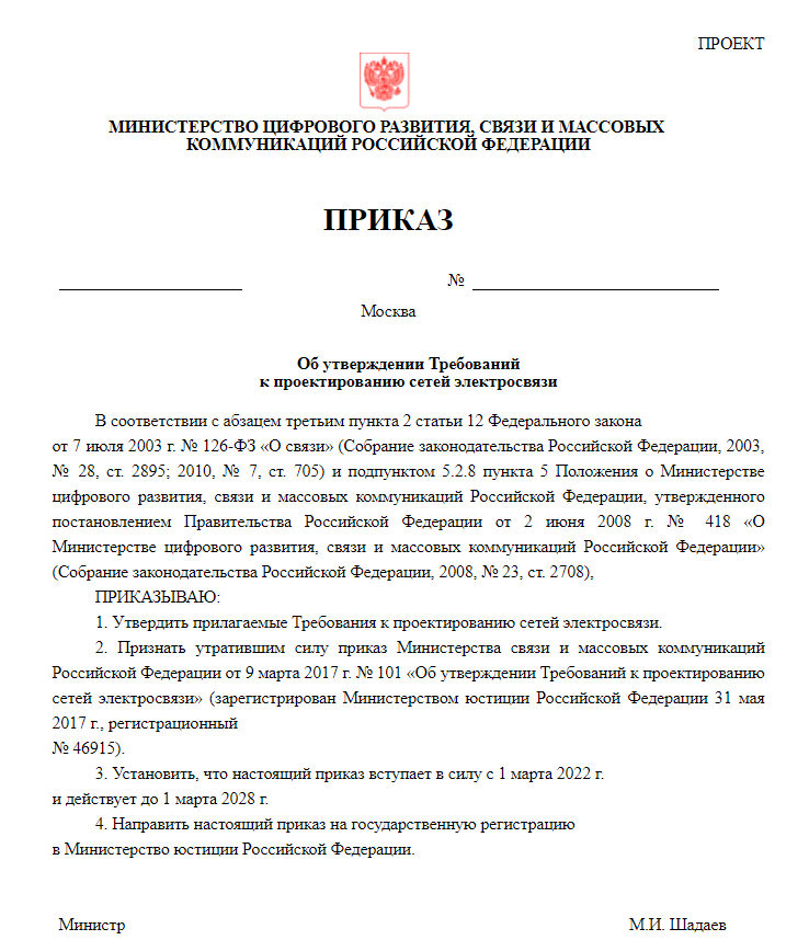 Напомним, проект новых требований к проектированию сетей связи был создан в рамках механизма "регуляторной гильотины". Он отменяет текущий приказ от 9 марта 2017 г. № 101 и вступает в силу с 1 марта 2022 года на 6 лет.