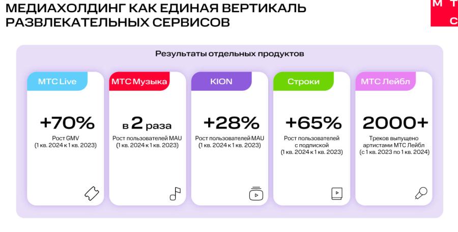 Холдинг "МТС Медиа", созданный в феврале 2024 года и объединивший бизнесы компании в сфере развлечений — Kion, "Строки", "МТС Музыка", "МТС Live" и "МТС Лейбл", также продолжает активно развиваться. Например, число уникальных пользователей за месяц (MAU) в онлайн-кинотеатре увеличилось на 28% год к году, а количество часов просмотра на пользователя — на 33%. Количество пользователей MAU в музыкальном сервисе "МТС Музыка" таже увеличилось, но уже в два раза, рост пользователей с платной подпиской в книжном сервисе "Строки" составил 65%, а "МТС Live" нарастил продажи на 70%.