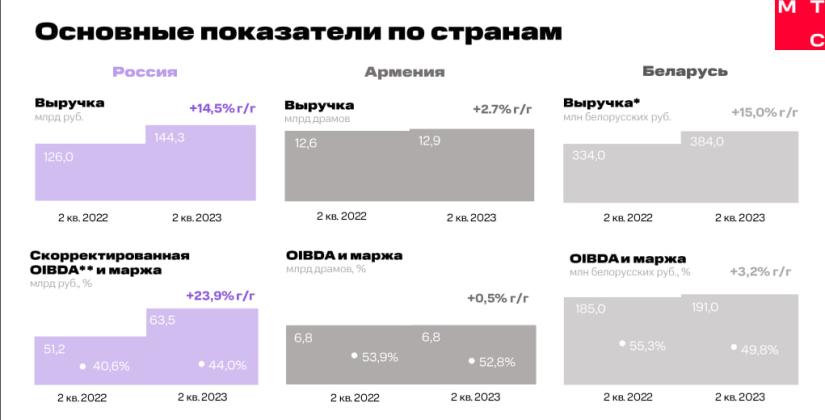 Вклад бизнеса в Армении в общую выручку составил 12,9 млрд драмов (на 23.08.2023 — порядка 3,2 млрд рублей). Доходы за 2 квартал увеличились на 2,7% в сравнении с аналогичным периодом 2022 года. Рост обусловлен высокий туристическим потоком, пересмотром тарифных планов и увеличением спроса на смс-рассылки. Абонбаза составила 2,3 млн. Выручка МТС в Беларуси увеличилась на 15% до 384 млн белорусских рублей (на 23.08.2023 — порядка 14,3 млрд рублей).