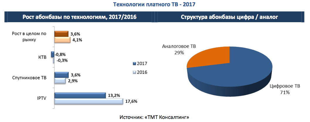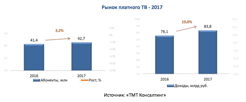 Агентство "ТМТ-Консалтинг" представило обновленные предварительные итоги рынка платного ТВ в 2017 году. Число абонентов выросло за год на 3,2% до 42,7 млн, проникновение услуги превысило 75%.
