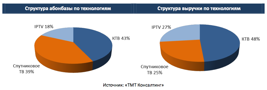 Доля кабельного ТВ в абонентской базе снизилась на 2 п.п. по итогам года, на столько же выросла доля IPTV. В структуре выручки КТВ потеряло 3 п.п., но на эту технологию все еще приходится почти половина рынка, спутниковое ТВ и IPTV делят оставшийся рынок в сопоставимых долях.