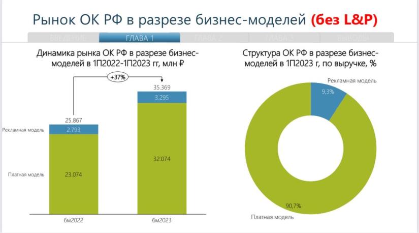 Выручка российских видеосервисов в 1 полугодии 2023 года увеличилась на 37% по сравнению с аналогичным периодом 2022 года и достигла 35,4 млрд рублей. 90,7% доходов обеспечила платная модель (подписки или покупка контента), а доля рекламной сократилась с 11% (2022 г.) до 9,3% (2023 г.). Такие данные представил TelecomDaily.