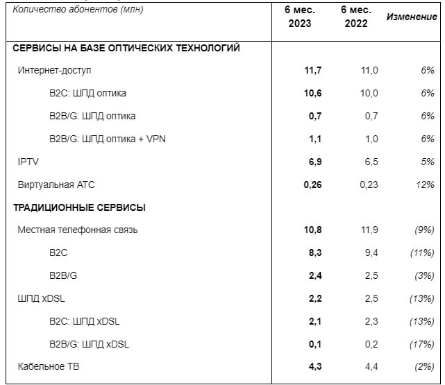 Выручка от услуг телевидения составила 21,5 млрд рублей за январь-июнь 2023 года и 10,7 млрд рублей за 2 квартал, тем самым обеспечив рост на 5%. Доходы от услуги фиксированного интернета достигли порядка 25,5 млрд рублей во 2 квартале и 51 млрд рублей в первом полугодии.