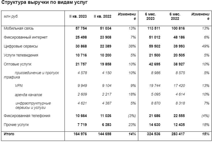 Если рассматривать структуру выручки по видам услуг, треть доходов приходится на мобильную связь — 57,5 млрд рублей во 2 квартале и 113,5 млрд рублей за 6 месяцев текущего года. Рост составил 13% в обоих случаях.