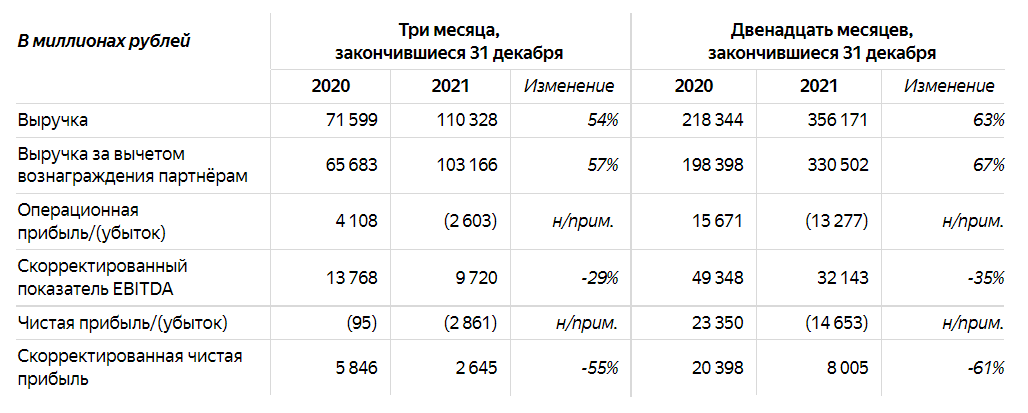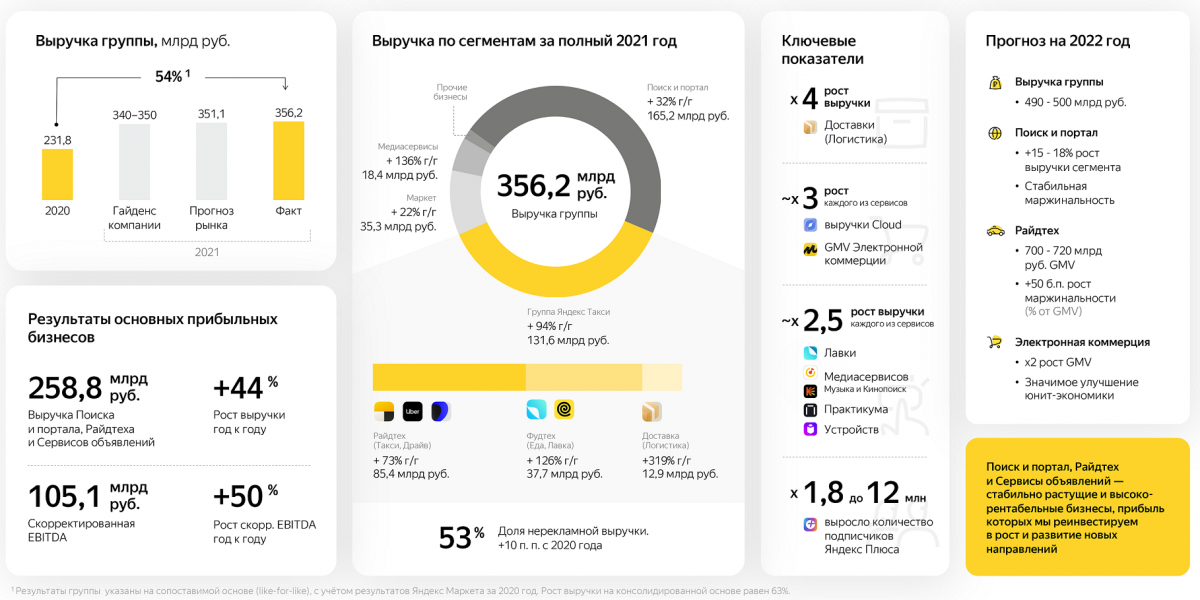 Общая выручка компании в 2021 года достигла 356,2 млрд рублей. В четвёртом квартале 2021 года выручка в сегменте Поиска и портала выросла на 31%, а выручка за вычетом вознаграждения партнёрам — на 32% по сравнению с аналогичными показателями год назад. Количество поисковых запросов (search queries) выросло на 7% по сравнению с аналогичным показателем за четвёртый квартал 2020 года.