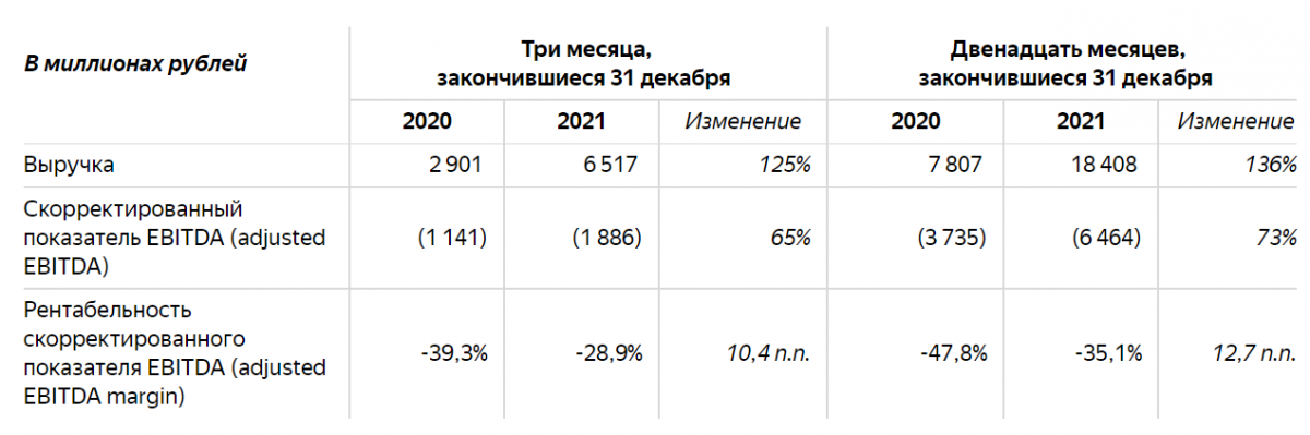 Рост выручки в сегменте медиасервисов также связан с ростом выручки от продажи устройств (объём продаж значительно вырос за счёт новых типов устройств) и ростом выручки от транзакций (в основном за счёт продажи билетов на мероприятия на фоне восстановления активности на рынке развлечений). Убыток по скорректированному показателю EBITDA составил 1,9 миллиарда рублей и был вызван затратами на контент и маркетинг для поддержки роста аудитории подписчиков Яндекс Плюса, а также ростом расходов на персонал в связи с расширением бизнеса.