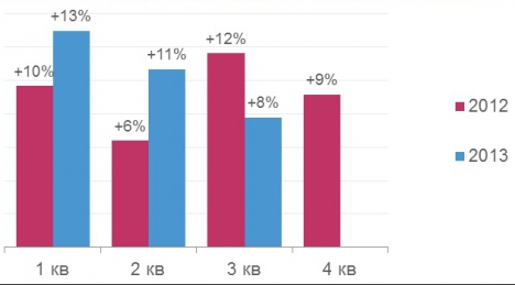 В III квартале несколько замедлилась динамика телерекламных бюджетов относительно первой половины года (7,8% против 11,8% в 2012 году). В первой половине 2013 года телереклама показывала положительную динамику (+12% к прошлому году). Во II квартале сохранились высокие показатели (+11% при ожидаемых среднегодовых +9%), но это произошло на фоне низких показателей II квартала 2012 года (всего +6% ко II кварталу 2011 года). Таким образом, II квартал 2013 года сравнивается с низкими показателями II квартала 2012 года. А III квартал, напротив, сравнивается с III кварталом прошлого года, оказавшимся самым динамичным периодом (реклама с августовских трансляций Олимпийских игр в Лондоне).