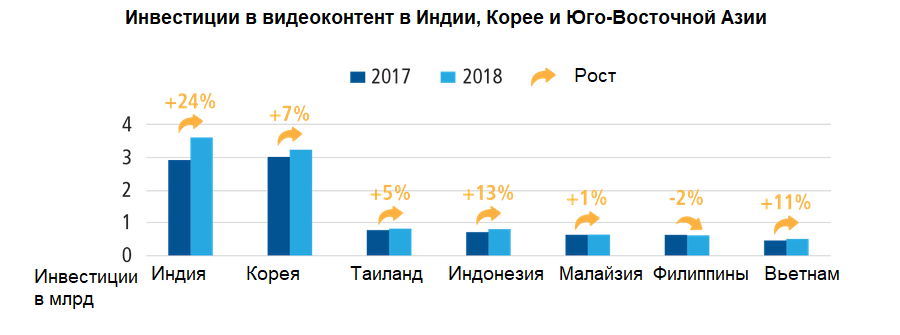 В качестве других очагов роста затрат на видеоконтент отмечены Индонезия, где расходы увеличились на 13% в 2018 году, до $800 млн, а также Вьетнам, где инвестиции выросли на 11% в 2018 году, до $500 млн.